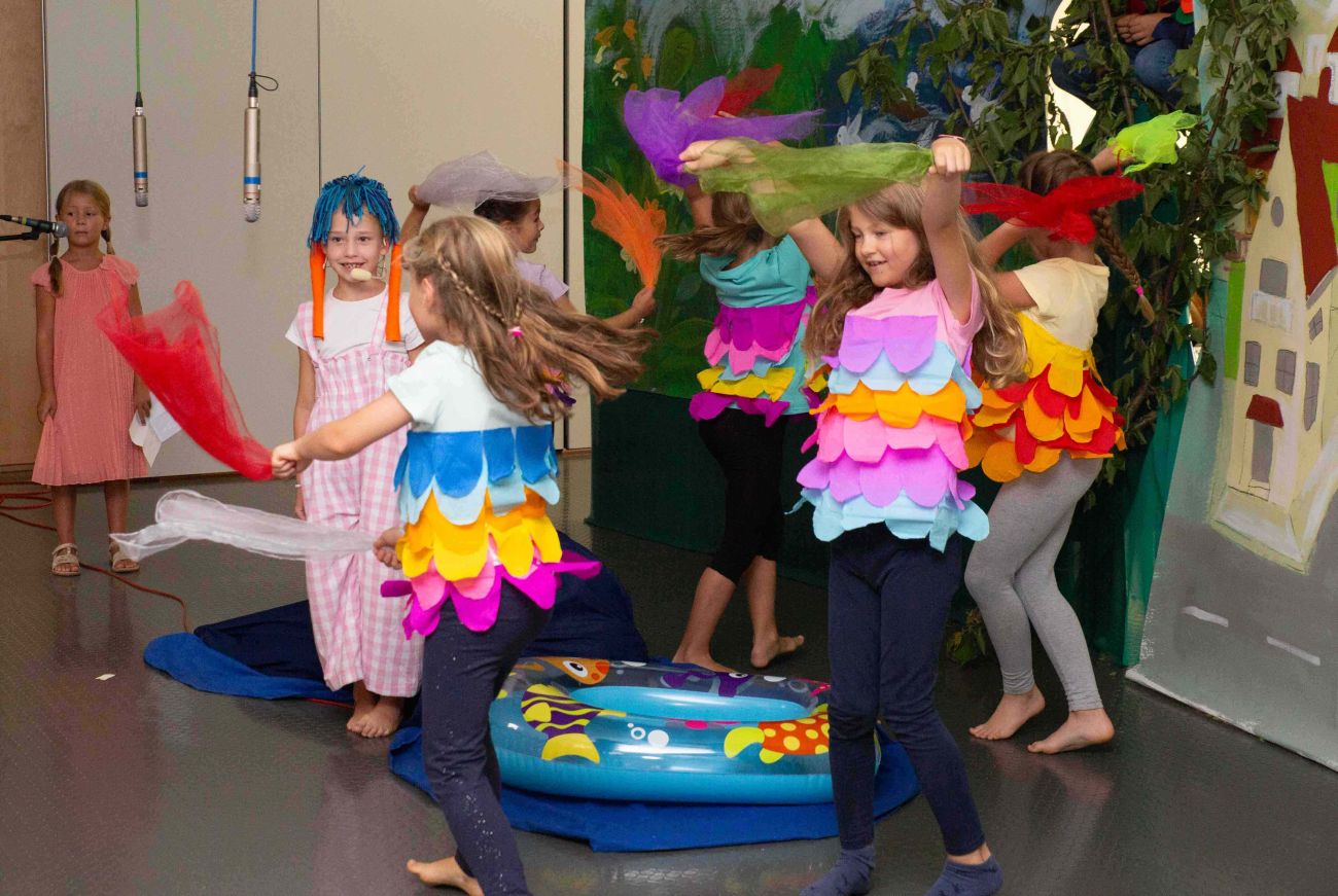 Extra für diesen besonderen Anlass hatte die Klasse 2b unter der Leitung von Frau Barbara Schmid das Theaterstück „Ich bin ich“ einstudiert. Gebannt und aus erster Reihe folgten die neuen Erstklässler der liebevoll inszenierten Reise des „Ichs“, welches auf der Suche nach Zugehörigkeit ist. So trifft es viele Tiere – Fische, Pferde, Hunde und Papageien – und entdeckt an ihnen Gemeinsamkeiten. Mal hat das „Ich“ dieselben Ohren wie ein Dackel, dasselbe Fell wie ein Pferd oder denselben Schwanz eines Papageis und fragt sich, ob es nun zu ihnen gehört. Enttäuscht muss es jedoch feststellen, dass die Unterschiede doch jedes Mal zu groß sind. Immer stimmt etwas nicht überein. Ganz niedergeschlagen fragt sich das „Ich“, wo es nun hingehört, als ihm plötzlich die Erkenntnis kommt. „Ich bin ich!“ Es ist einzigartig und das ist nicht nur vollkommen in Ordnung, sondern macht ihn zu etwas Besonderem. Und trotz oder gerade wegen dieser Einzigartigkeit wird es herzlich von allen Tieren in deren Mitte aufgenommen. Denn: „Du bist du!“