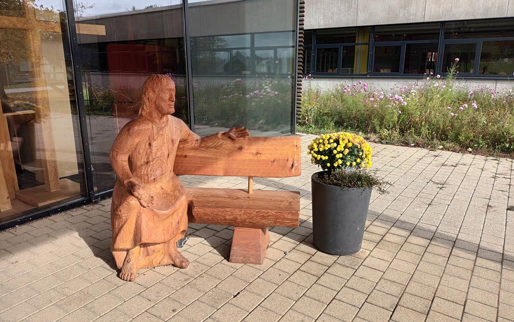 Unsere Schülerin Aurora war schwer an Krebs erkrankt. Sie wünschte sich im Herbst eine Möglichkeit, mit Christus in Dialog zu treten. Eine Bank, auf der sie sich neben Jesus setzen kann, um Hoffnung und Kraft zu schöpfen für ihre kräftezehrende Behandlung. So war die Bank für Aurora eine Hoffnungsbank, die sie sich nicht nur für sich selbst, sondern auch für alle anderen Kinder und Jugendlichen wünschte, die an der MKS Jesus nahe sein möchten, weil sie Trost brauchen, nachdenken oder sich einfach an eine starke Schulter anlehnen wollen.
