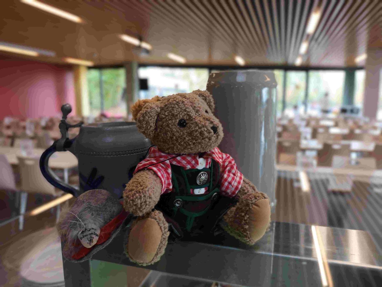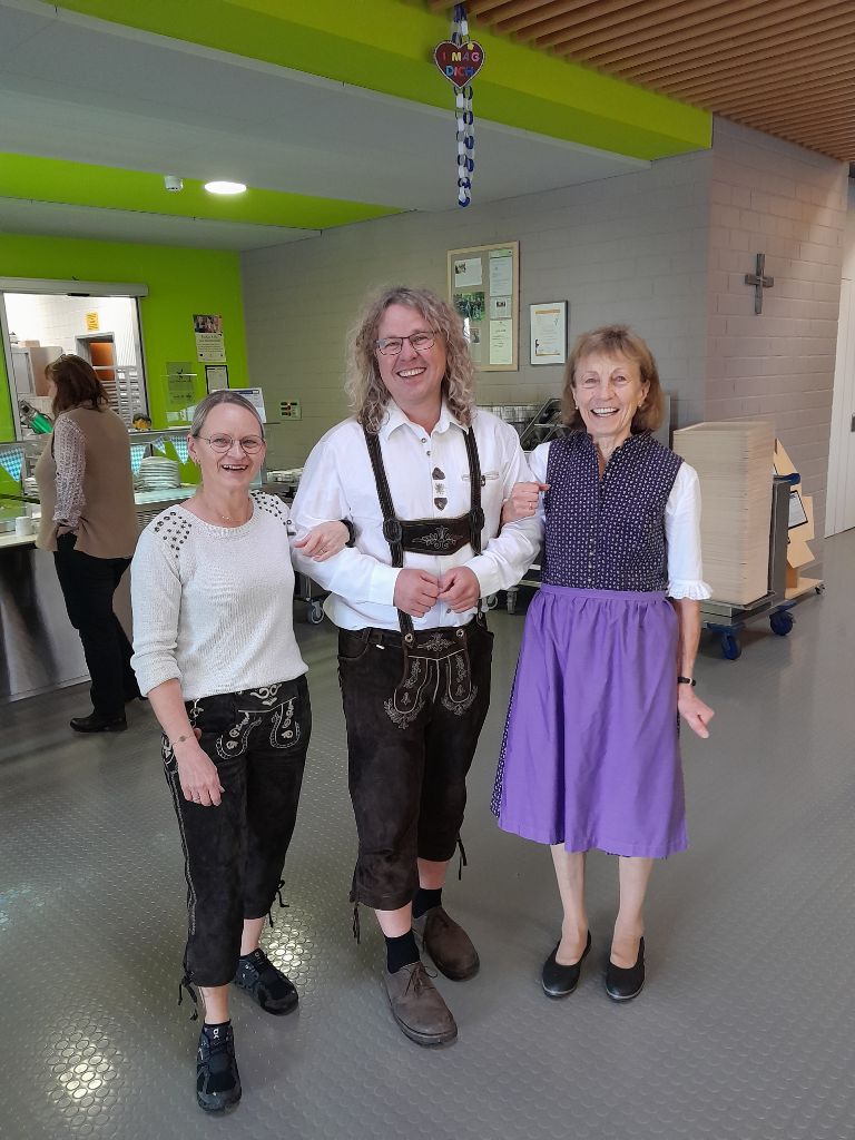 Unsere Mensa verwandelte sich zu einem kleinen Festzelt mit bayrischer Dekoration. Die Tische und die Essensausgabe wurden mit blau-weißer Deko, Lebkuchenherzen, Salzstangen und Brezeln dekoriert, was ein willkommener Nachtisch für unsere Schüler war. Unser Chefkoch Peter Gulde kredenzte uns dazu eine Woche lang kulinarische Köstlichkeiten wie Brathändl, Leberkäs, Germknödel und vieles mehr. Die Schüler ließen es sich nicht nehmen und stiegen direkt freudig in die bayrische Woche mit ein, indem sie mit Dirndl oder Lederhosen in die Schule kamen. Dabei fühlten sich auch einige Mitarbeiter animiert so in die Schule zu kommen. Natürlich durfte die passende Musik nicht fehlen und so lief in der Mensa Blasmusik. Hierbei sangen sogar einige Schüler mit und schunkelten passend zur Musik.