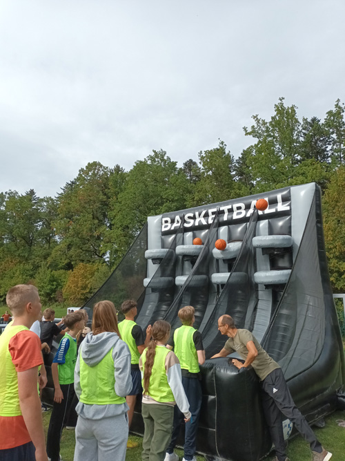 Am 5. und 6. Oktober war mal wieder richtig was los auf der großen MKS-Wiese! Das Trixitt-Team aus dem Ruhrgebiet machte auf unserem Sportplatz Halt und warf die Gebläse an, damit sich um die 500 Schülerinnen und Schüler für ein paar Stunden gemeinsam auspowern konnten. Zunächst war Aufwärmen angesagt, dann ging es meist im Duell mit der Parallelklasse darum, am meisten Punkte für das Team zu holen. Beim Känguruh-Weitsprung musste ein Tennisball in die Tonne, im Menschen-Kicker galt es, geschickt den Ball ins gegnerische Tor zu lenken, was auch beim Kleinfeldfußball kein Problem für die Kinder und Jugendlichen war. An überdimensionalen Basketballkörben ernteten die Klassen ebenfalls eine Menge Score-Punkte, genauso wie auf den vielen Metern Laufstrecke, die sie bei der Laufchallenge zu absolvieren hatten. Auch Völkerball, ein Spiel, das die Kids mit ihren Sportlehrern öfters spielen, wurde im aufblasbaren Kleinfeld zur echten Gaudi. Absoluter Höhepunkt war jedoch der Hindernisparcours in Form einer riesigen Hüpfburg, in der die Klassen möglichst viele Durchgänge inklusive Kletterpassage und Rutsche zu passieren hatten, ein Riesenspaß, der vom Erst- bis zum Zehntklässler jeden begeisterte!