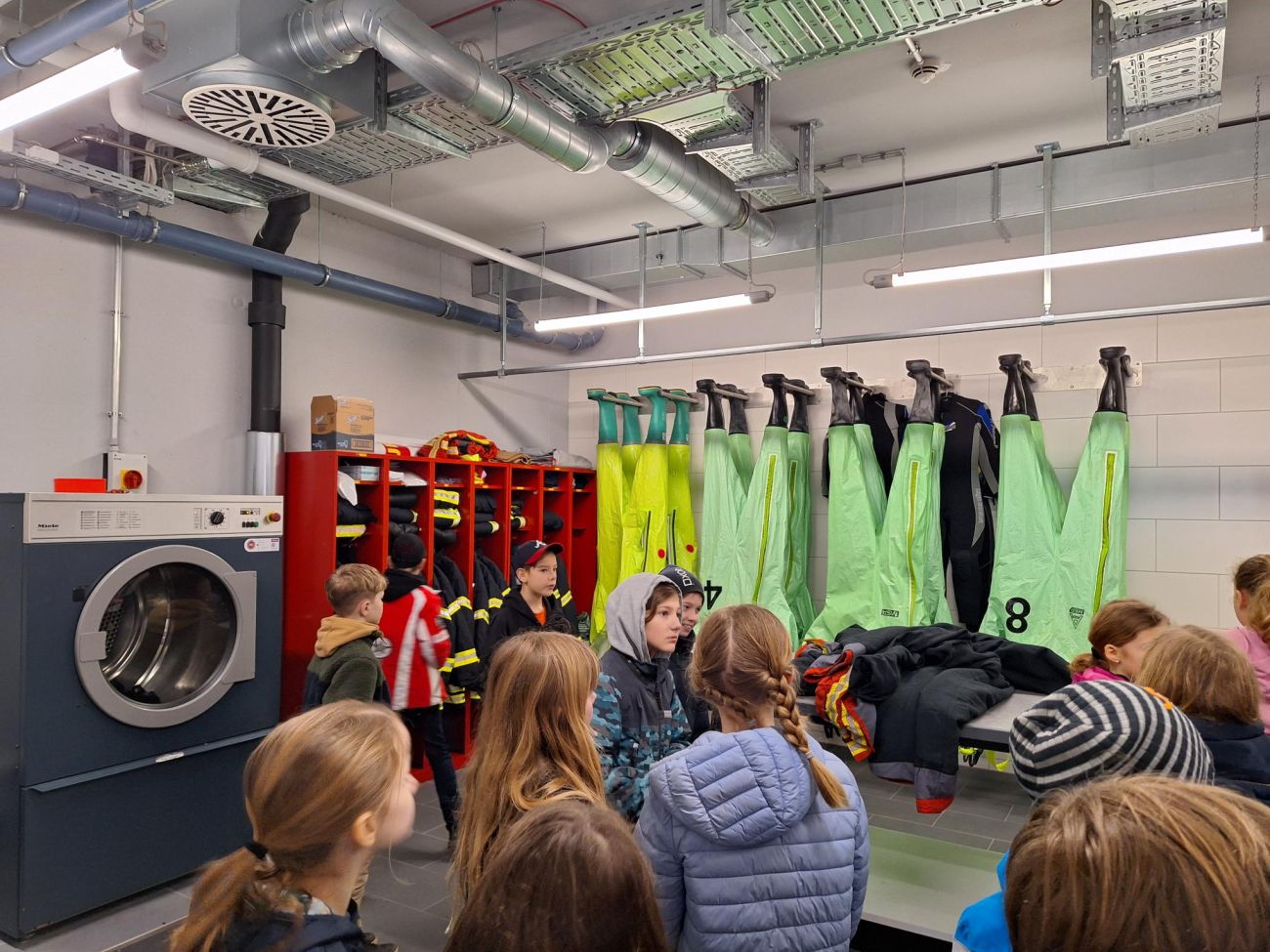 Die Führung ging los im Parktunnel der Feuerwache, wo die Feuerwehrleute beim Einsatz mit ihren Autos eintreffen, von dort aus ging es in die Umkleidekabinen und dann weiter zu den Fahrzeugen. Beeindruckt lauschten die Kinder, was in den elf Einsatzfahrzeugen angefangen vom Mannschaftswagen bis zum Löschfahrzeug, dem Gefahrgutlaster und der Drehleiter alles in der Rottweiler Wache vorhanden ist. Fragen über Fragen tauchten auf: Was passiert mit den dreckigen Stiefeln, Anzügen und den nassen Schläuchen nach dem Einsatz? Können die Feuerwehrleute auch in der Wache übernachten? Wie lange dauerte bislang der längste Einsatz? Ein ganzes Interview der 4c mit noch mehr Fragen findet sich übrigens im MKS-Blog!