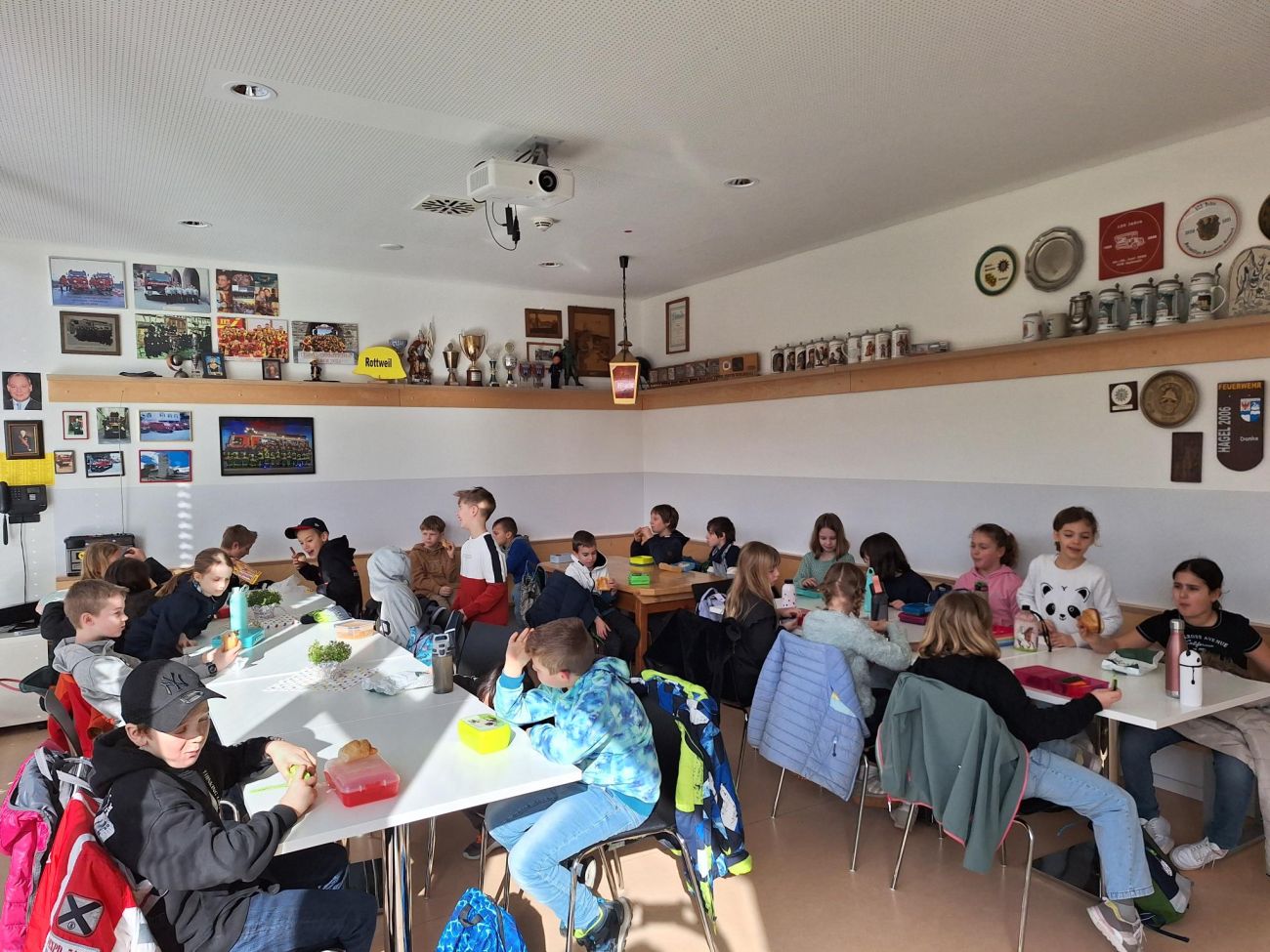 Nach so vielen Eindrücken stand erst mal vespern auf dem Programm. Hierzu durften die Kinder in den Mannschaftsraum, der sich zusammen mit Büros, dem Raum der Jugendfeuerwehr und einem großen Schulungsraum im Obergeschoss der Feuerwache befindet.