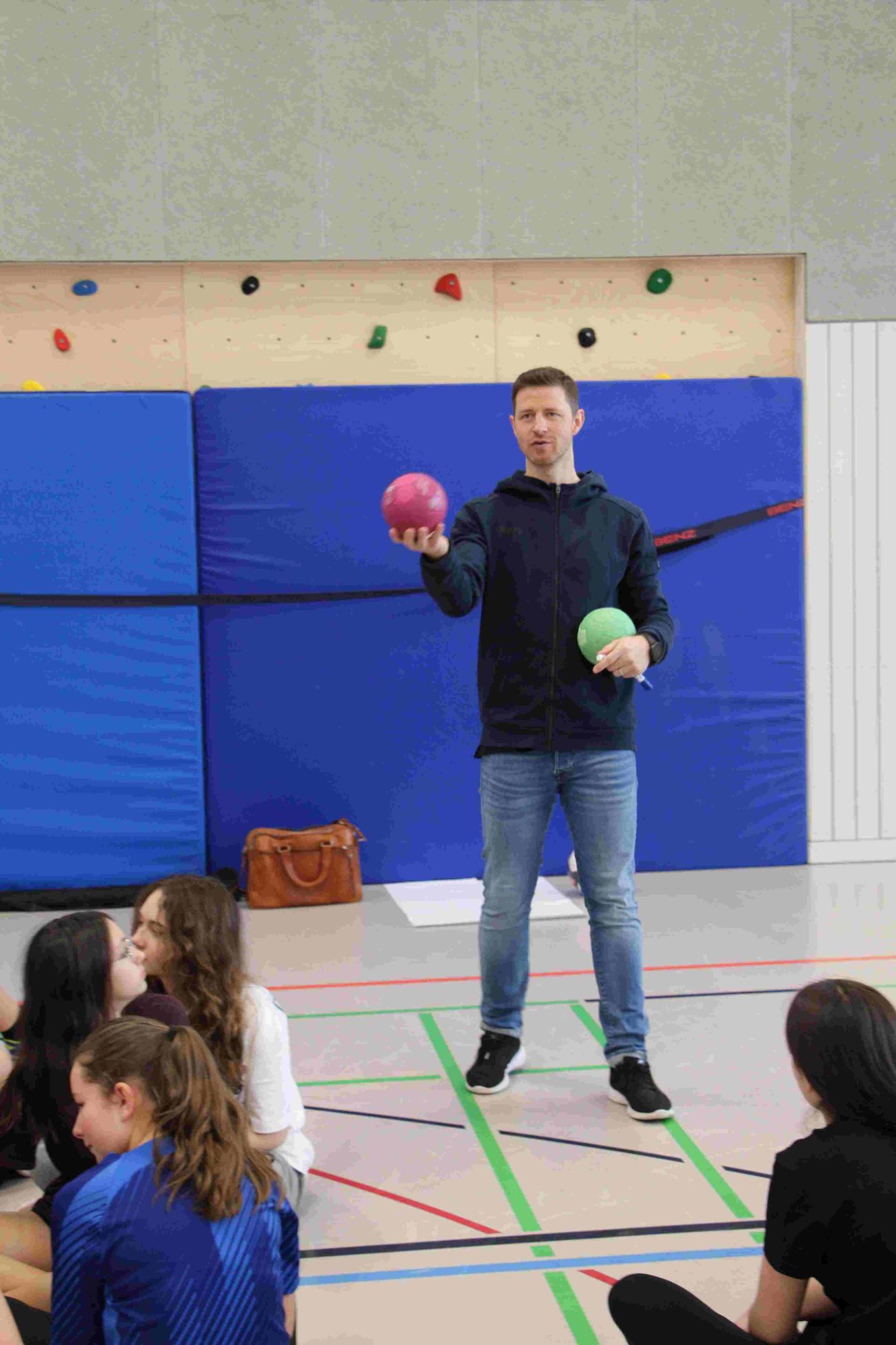Einen etwas anderen Schulvormittag erlebten kürzlich die Klassen 7a und 8a, als der ehemalige Handballprofi Martin Strobel wieder einmal zu Gast an der Schule war, an der er seine Grundschulzeit verbrachte. Mit seiner Schultour „Spiel-den-Ball“ besucht er seit 2022 immer wieder Schulen, um einzelnen Klassen auf spielerische Weise und mit einem Hauch Handball-Feeling Teamgeist und ein Gemeinschaftsgefühl zu vermitteln, auf das es im Schul- und Berufsalltag immer wieder ankommt.