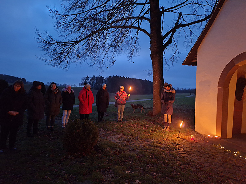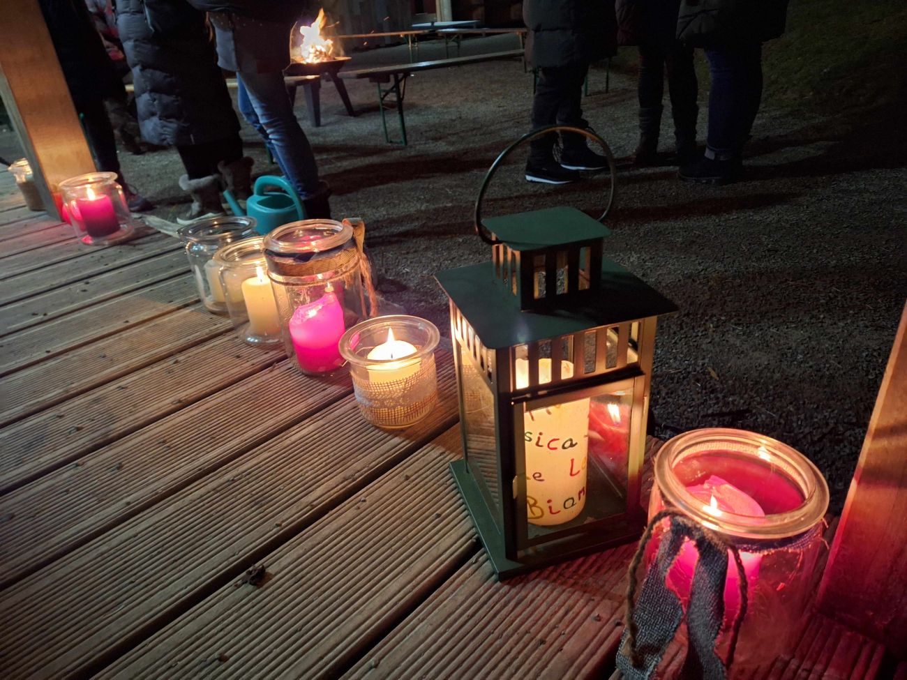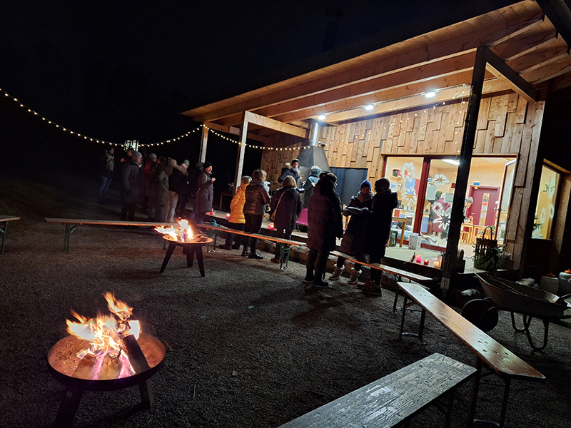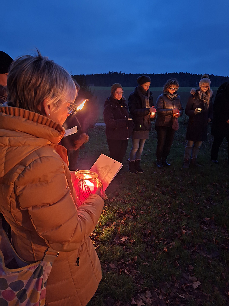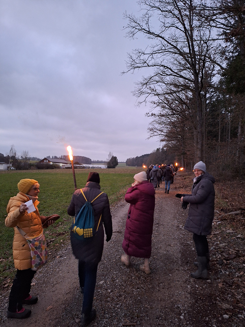Der Einladung unserer Ganztagesmitarbeiterinnen Frau Sauter und Frau Merkl zu einer besinnlichen Adventsfeier am Naturhort waren am 12. Dezember viele Mitarbeiterinnen und Mitarbeiter gefolgt. Am wunderschön dekorierten und beleuchteten Naturhort starteten wir in der Dämmerung zu einer Fackelwanderung durch den Hausener Wald bis zur Kapelle, wo umrahmt von brennenden Kerzen ein meditativer Impuls von Frau Jorga folgte. Zeit für Besinnung im hektischen Alltag und Zeit, um sich gedanklich mit "Engeln auf Erden" zu beschäftigen, wozu es eine nachdenkliche Geschichte gab.