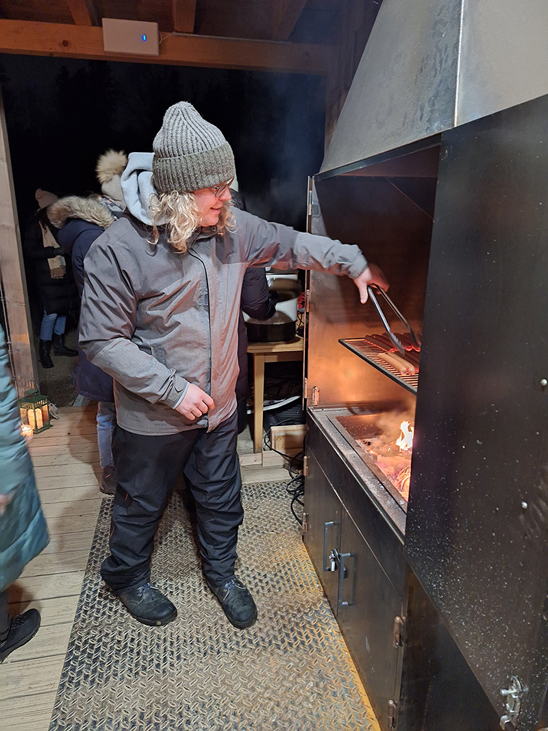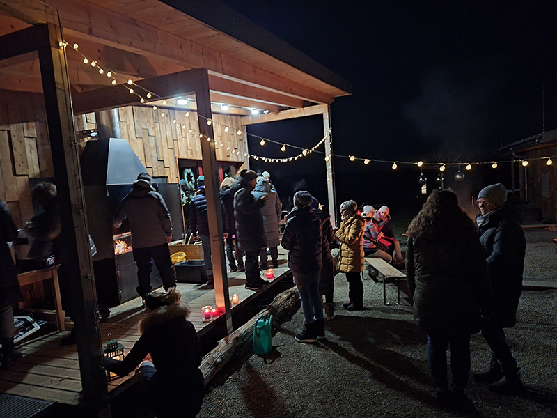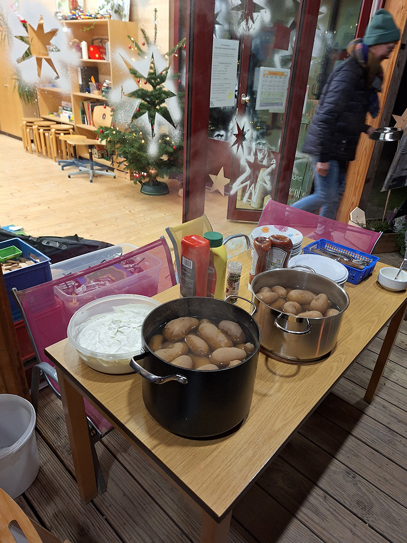 Nach der Rückkehr zum Naturhort wurden dort Würste gegrillt, es gab Pellkartoffeln mit Quark und dazu Glühwein und Punsch zum Wärmen. Am Lagerfeuer wurden noch einige Weihnachtslieder gesungen, die von Herrn Mauch und Frau Engster wie immer gekonnt an der Gitarre begleitet wurden.