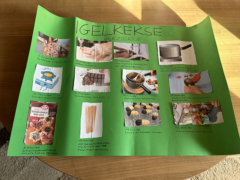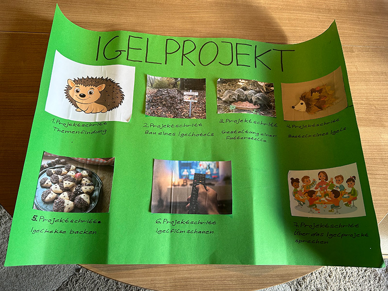 Zunächst galt es für Vincent ein Thema zu finden, was mit dem Igel passend zum Naturhort einfach war. Das Thema sollte anschaulich mit den Kindern erlebt, erarbeitet und praktisch durchgeführt werden. Dazu schauten sie gemeinsam einen Film über Igel an, erstellten Plakate und bastelten Igel aus Tonpapier. Auch entschied sich Vincent für den Bau eines Igelhotels im Hortwald mit Futterstelle, an die nun regelmäßig Futter ausgelegt wird. Auch gebacken wurde mit den Kindern, so sind leckere Igelkekse entstanden, die direkt im Hort verziert und sogleich vernascht wurden.