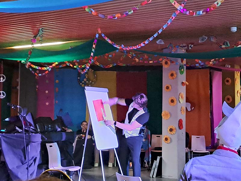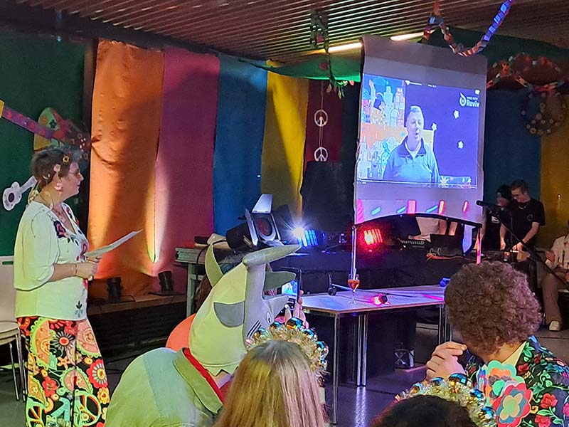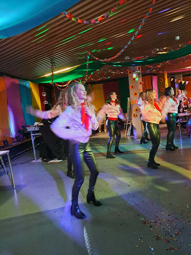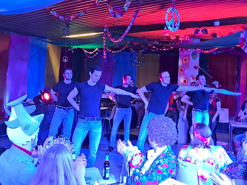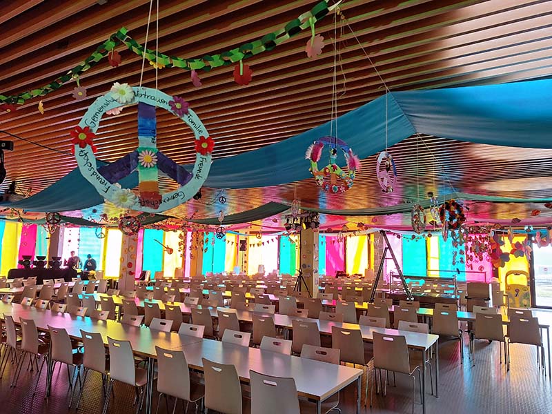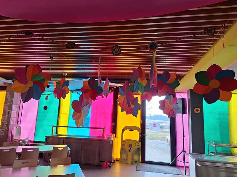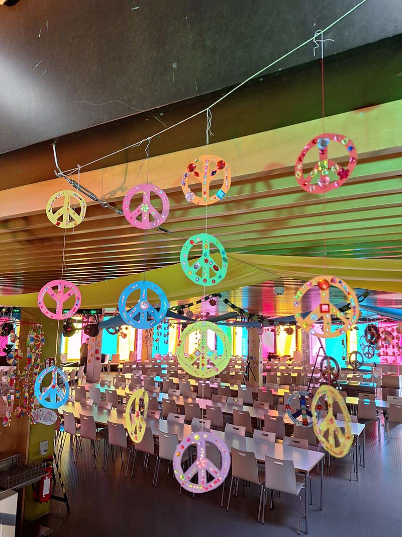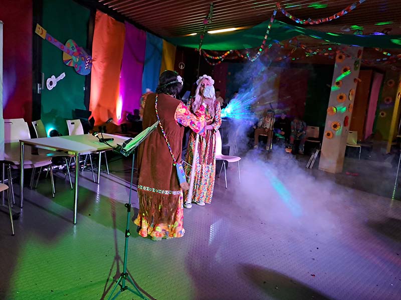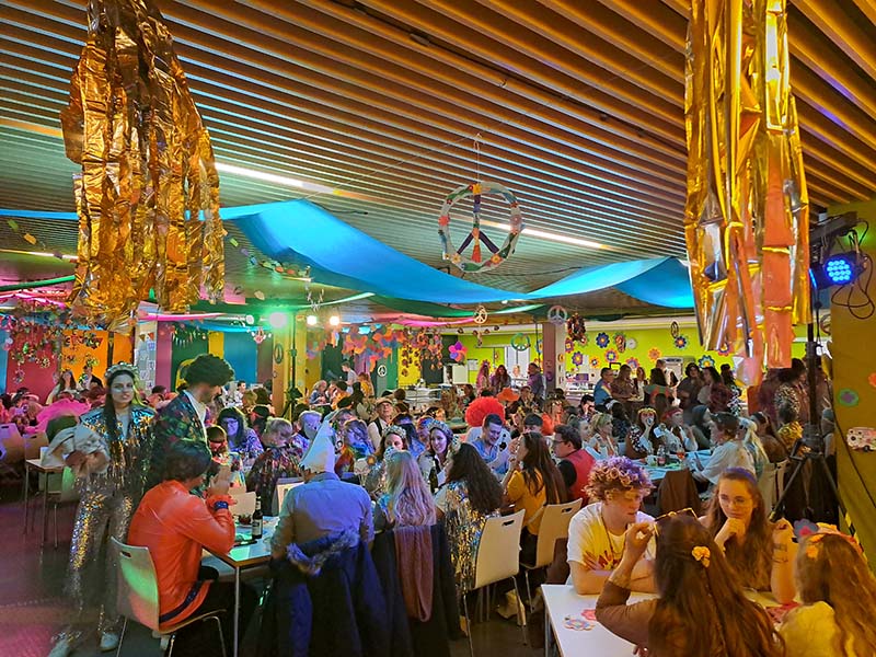 Der Kolbeball am 21. Februar lud wieder einmal zahlreiche Eltern, Ehemalige und Mitarbeiter in die farbenfroh geschmückte Mensa ein. Schon Wochen zuvor bastelten die Klassen eifrig Prilblumen, Peace-Zeichen, Blumengirlanden und vieles mehr, um die Party-Location entsprechend dem Motto 70er-Jahre schön bunt herzurichten. Und das tat unser Projektteam mit Unterstützung der Tontechniker auch, stundenlang wurde aufgebaut, dekoriert, verkabelt und vorbereitet, bis die gut gelaunten Gäste nach einem Willkommensdrink schließlich ins Blumenmeer eintauchen durften. Zahlreiche Auftritte von Lehrkräften und Mitarbeitern, aber auch einer Hausener Tanzgruppe sorgten neben einiger kulinarischer Highlights aus der MKS Küche für eine tolle Einstimmung in die Mottoparty. Nach vielen lustigen und unterhaltsamen Programmpunkten hielt es dank DJ Seamless alias Tobias Eichinger jedoch niemanden mehr auf den Stühlen. Ununterbrochen legte er einen Hit nach dem anderen auf und sorgte so für eine 4-stündige bombastische Tanzparty an seiner ehemaligen Schule.