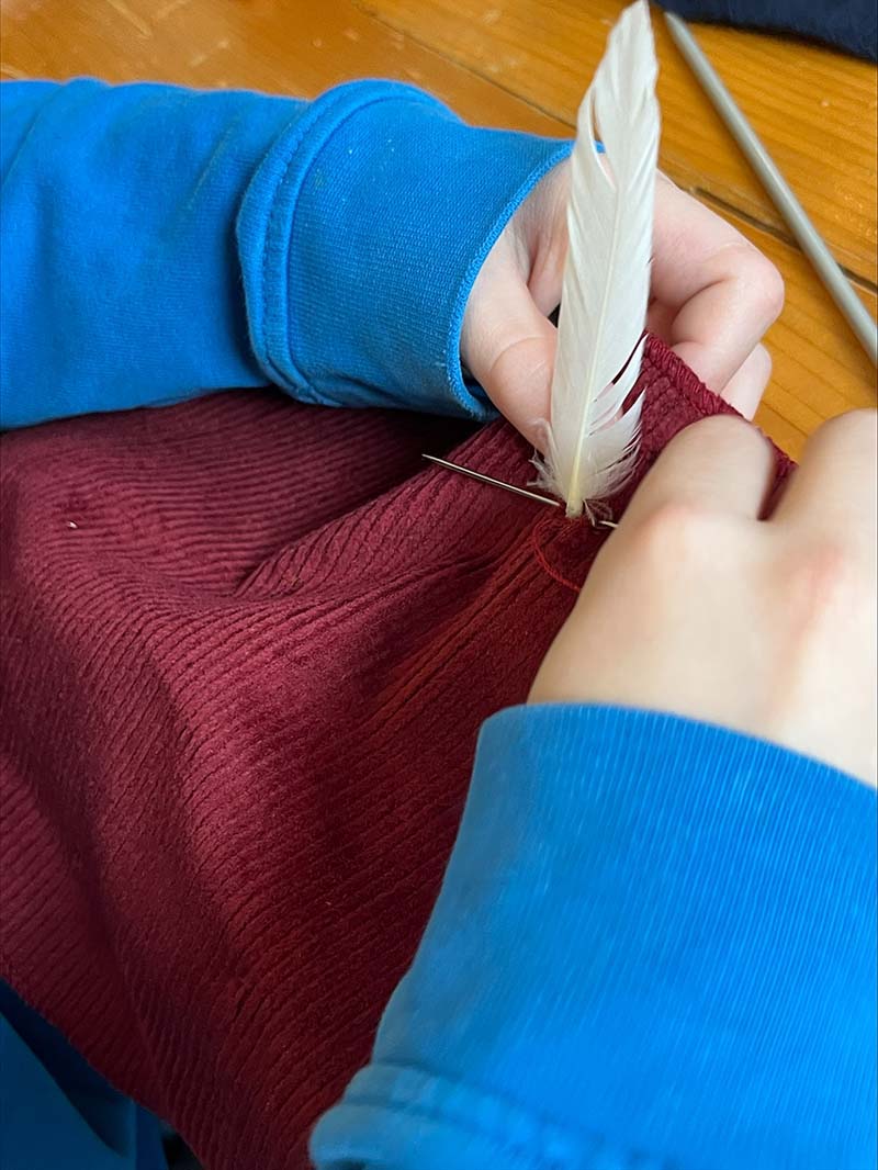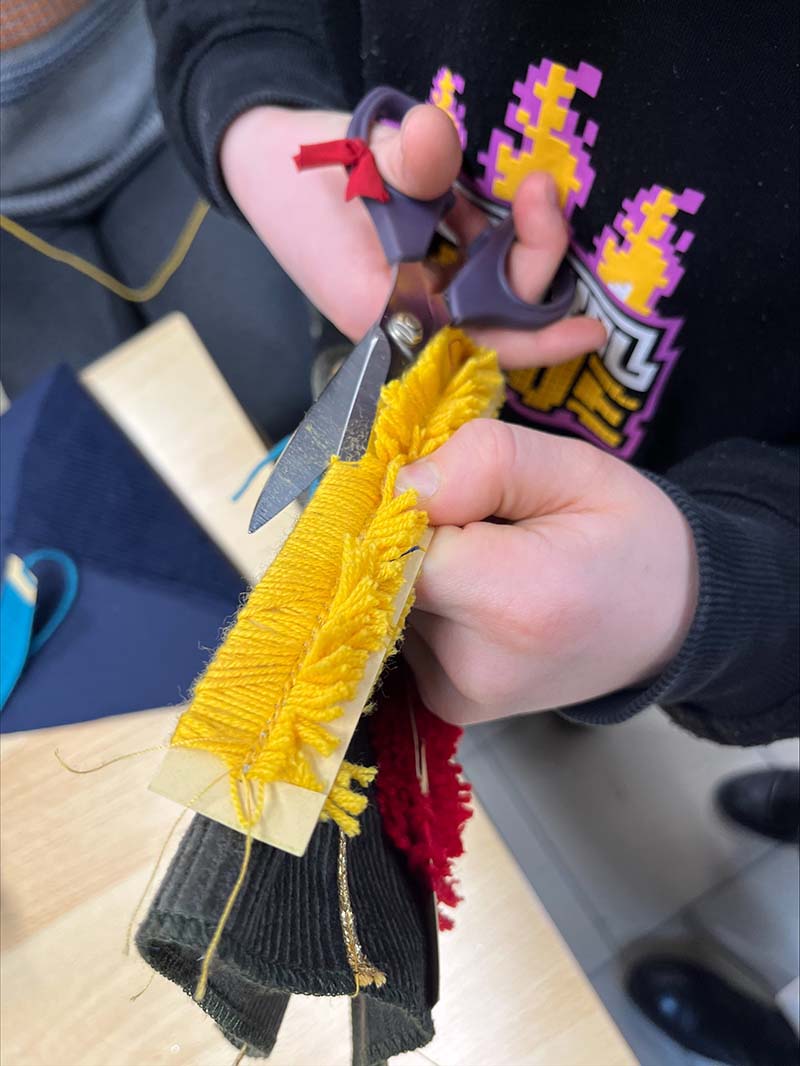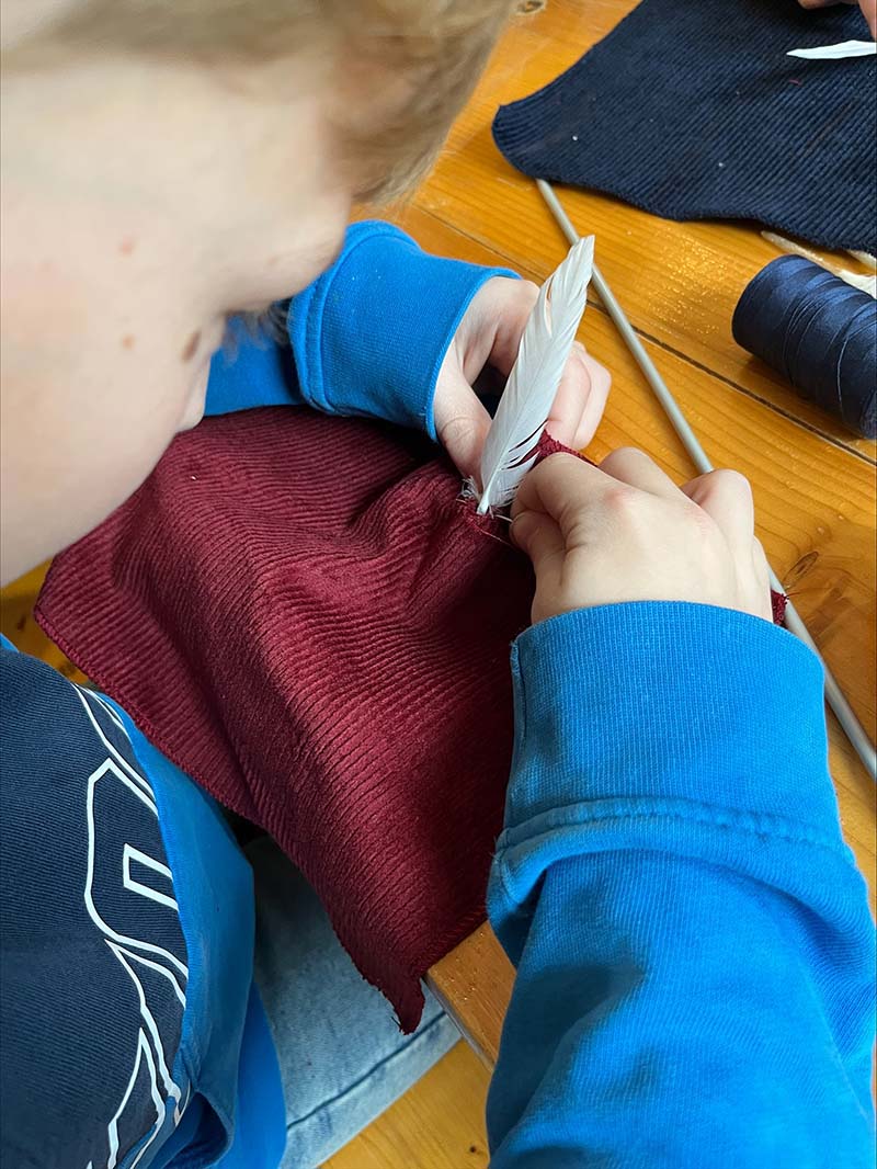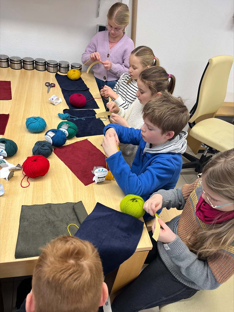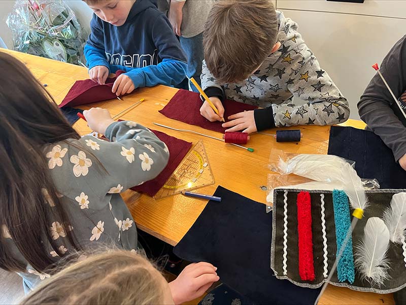 Das engagierte Team von Frau Beck, der Mutter unserer FSJlerin Elisa, unterstützte die Kinder tatkräftig bei ihren kreativen Projekten. Unter Anleitung lernten die Kinder, Federn von Hand zu nähen und das Wickeln von Fransen zu meistern. Sie waren äußerst eifrig und zeigten viel Kreativität, was zu wunderschönen Unikaten führte, die sie stolz mit nach Hause nehmen konnten.