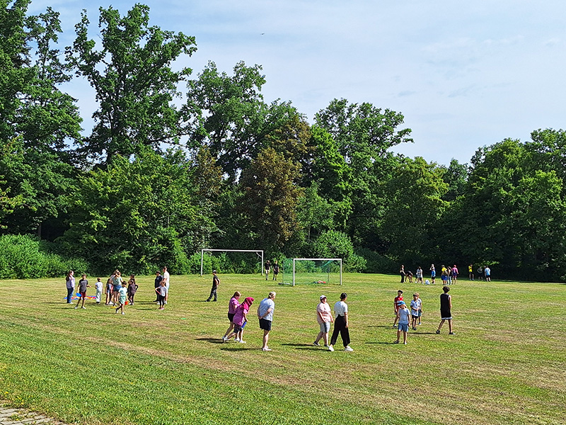 Unsere Klassen 9a und b und die Klasse 2c waren sogar voll mit dabei! Die 9a übernahm das Catering und stand schon kurz vor acht in der Küche, um Muffins und Kuchen zu backen, Obst zu schneiden, eine Trinkstation einzurichten und den Grillplatz für das Mittagessen vorzubereiten. Die 9b betreute auf den Sportplätzen und in der Turnhalle viele Mitmachstationen und die 2c mischte sich in der Turnhalle mitten unter die Gäste, um Kontakte zu den fremden Kindern zu knüpfen und viele Stationen gemeinsam mit ihnen auszuprobieren. Das geschah auch in der Mittagspause, als sich MKS und GWS auf den Schulhöfen, Sportplätzen und im Schülercafé mischten. Es wurde gemeinsam Billard und Federball gespielt, die Hühner und Hasen wurden gestreichelt und unser Schulgarten und Hortgelände wurde gemeinsam erkundet. Mittendrin war ein kleines Team unserer Schulsanis aus der 10a, die den Sporttag als Ersthelfer begleiteten, zum Glück war außer einem kleinen Pflaster jedoch keine Erste Hilfe notwendig. Unsere Gäste hatten sichtlich Spaß und so mancher wünschte sich gerne täglich kommen zu dürfen.