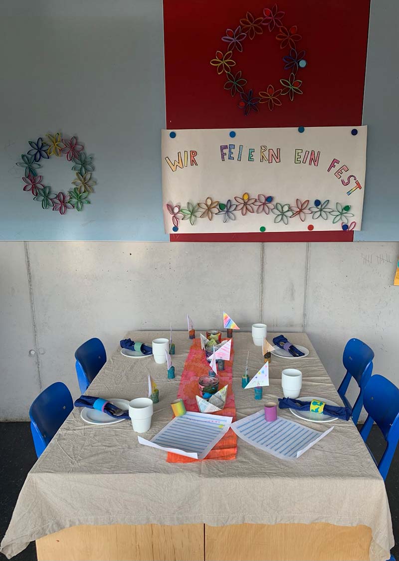 Die Erstklässler planten ein nachhaltiges Fest mit der Klasse und haben sich für die Tischdeko dem Upcycling gewidmet: für Tischkärtchen wurden Korken verwendet, anstatt Papierservietten lagen Stoffservietten auf dem Tisch, eingerollt in bemalte Klorollen-Ringe. Marmeladengläser wurden zu Tischlichtern, Tapeten, Buchseiten und Zeitungspapier zu Plakaten, Booten und Buchstaben verarbeitet.