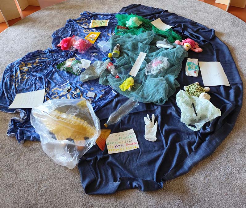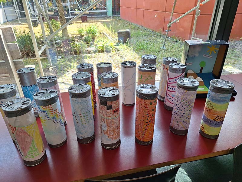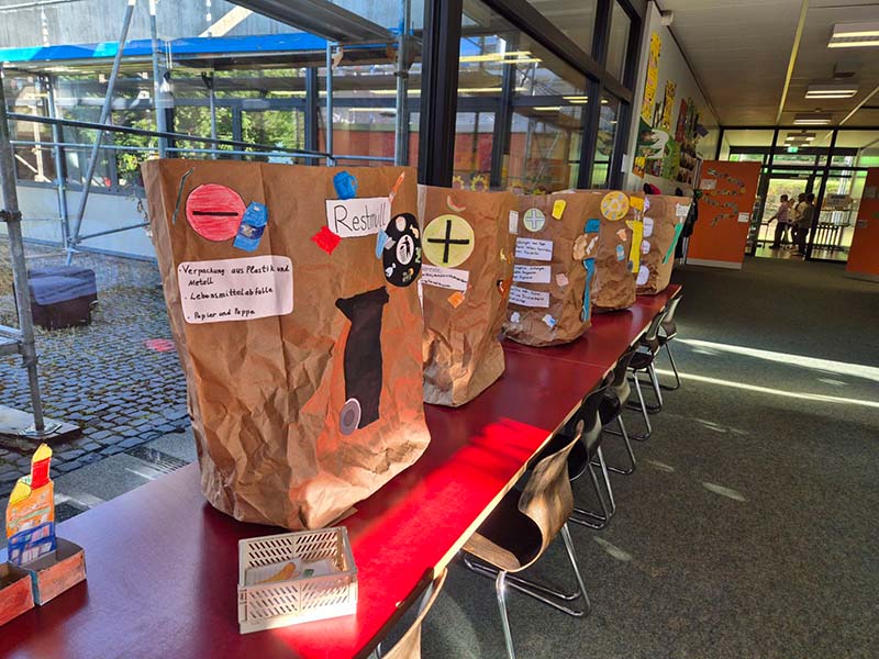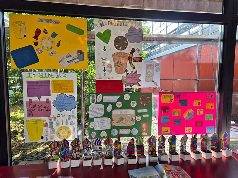 Stufe 4 hatte das Thema "Achtsamer Umgang mit meiner direkten Umwelt" und beschäftigte sich viel mit dem Thema Müll, dessen Vermeidung und Trennung. Auch sie haben ein Upcycling-Projekt gestaltet und ein Kresse-Türmchen im Hundertwasserstil gebastelt. Bei der Ausstellung durfte man bei den Vierern Müllkärtchen in riesige Mülltüten sortieren und lernte dabei auch, was z.B. nicht in den gelben Sack gehört.