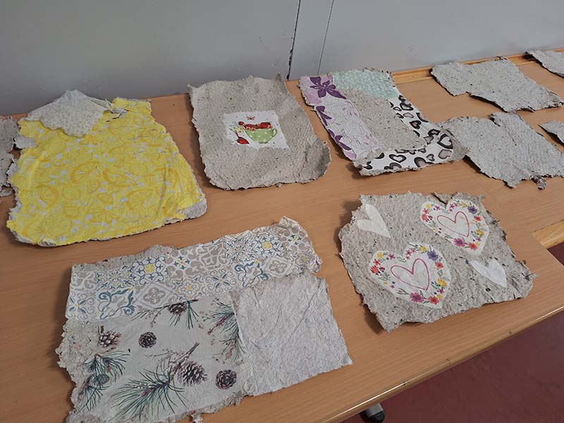 Die Fünfer haben unser Essen und z.B. Nahrungsverpackungen genau unter die Lupe genommen. Was steckt drin in unserem Essen, was kaufen wir ein oder wie könnten wir es auch selbst herstellen? So wurde in der Schulküche und im Schülercafé eigenes Müsli hergestellt. Das knusprige Granola u.a. aus Nüssen, Haferflocken, Kernen und Honig erfreute sich beim nachhaltigen Frühstück in der Mensa großer Beliebtheit. Beim (Alt)-Papierschöpfen und Baumwoll-Taschen bedrucken waren sie zusätzlich kreativ unterwegs.
