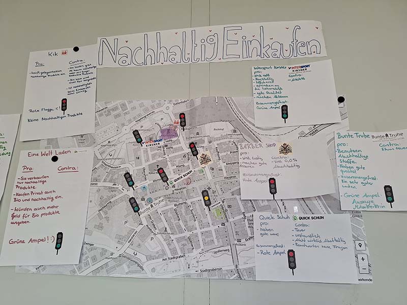 Die siebten Klassen befassten sich mit der Frage "Wie verhalte ich mich nachhaltig und sozial?". Dabei nahmen sie Rottweil als Einkaufstadt genau unter die Lupe und schauten und fragten vor Ort nach, wie nachhaltig die Supermärkte und der Einzelhandel am Markt agieren. Dafür wurden Interviews geführt, woher z.B. die Ware kommt, welche Qualität sie hat und wieviel Müll im Betrieb anfällt.