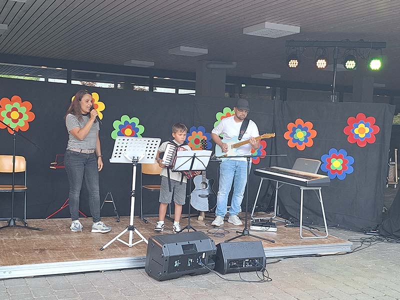 Ihrem Aufruf folgten vier Gruppen, die alle ihre Wurzeln an der MKS haben. Jüngstes Bühnentalent war Samu Zeller aus der Klasse 3b, der mit einem Akkordeon, seinem Papa an der E-Gitarre und seiner Mama am Gesang zwei fetzige Songs performte und tosenden Applaus hierfür bekam. Ihr Bühnenname "Die drei lustigen Vier" war Programm.
