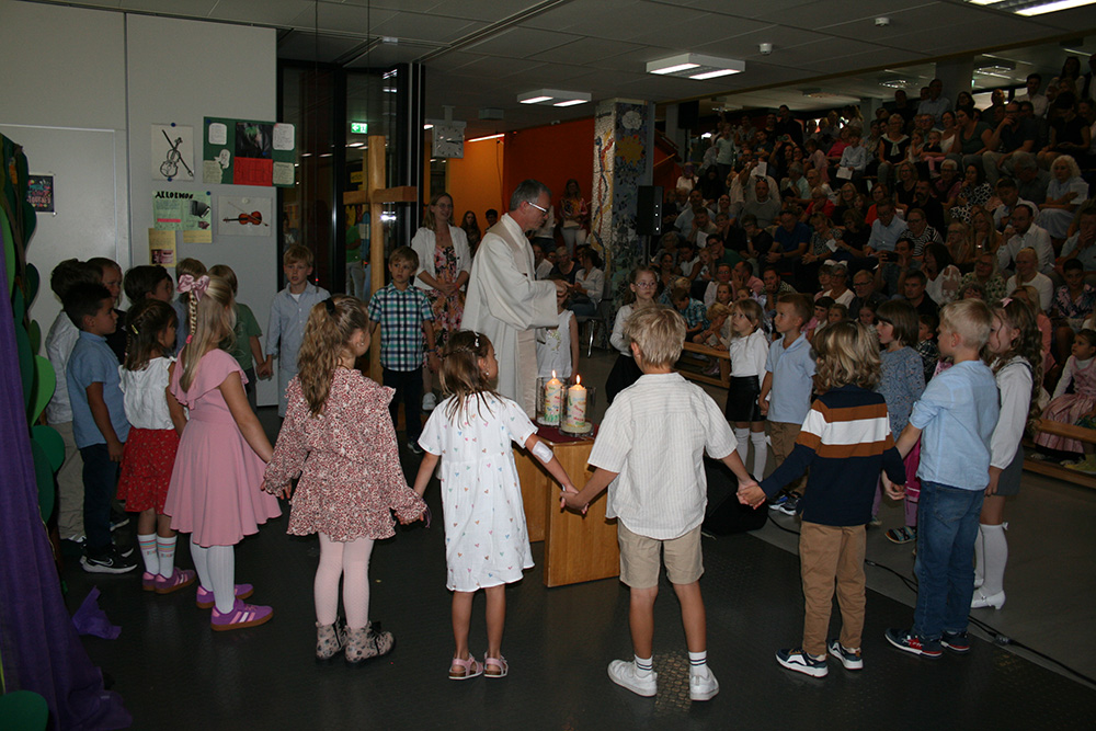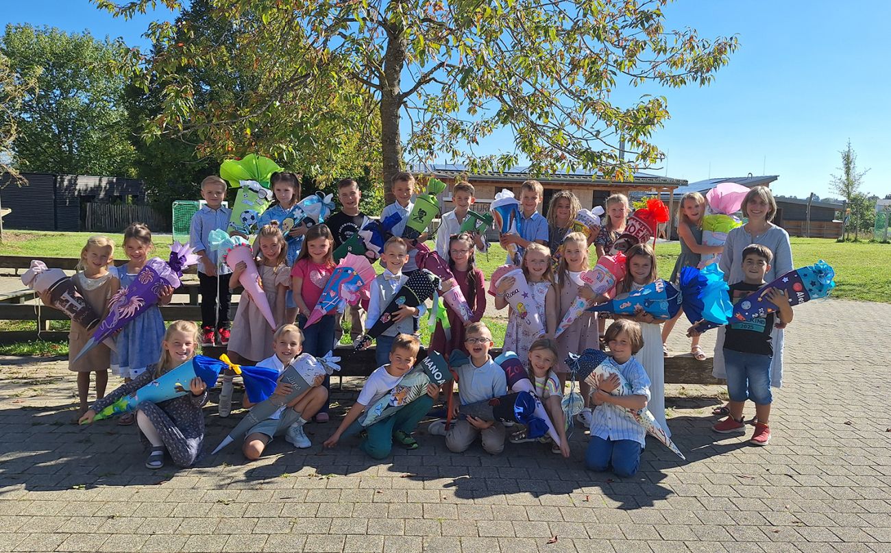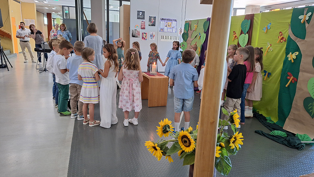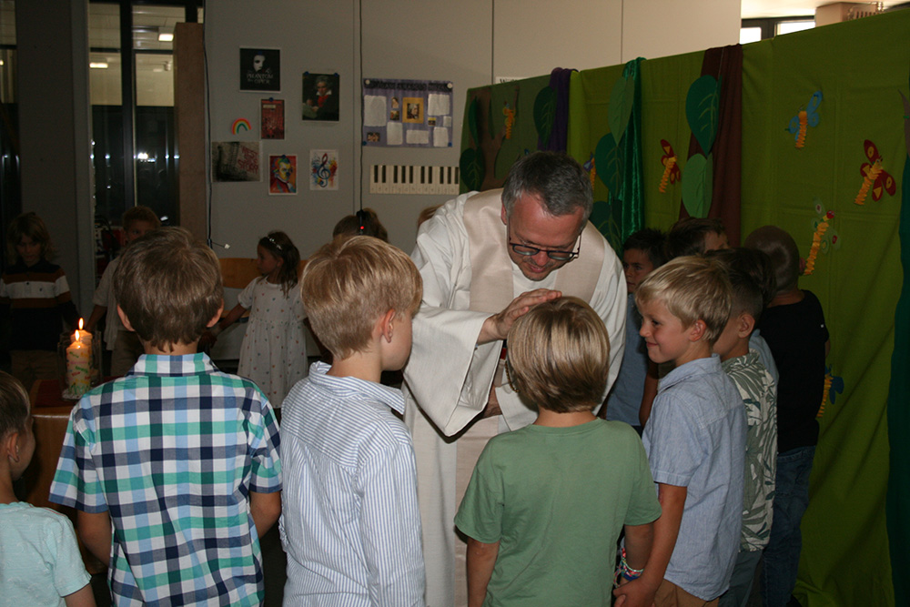 Dass unsere Erstklässler viele neue Freunde in der Maximilian-Kolbe-Schule finden und sich wohlfühlen in ihrer Klasse, das wünschten sich deren Klassenlehrerinnen Frau Brödel, Frau Müller und Frau Arnold genauso wie Pfarrer Timo Weber, der die Kinder beim Gottesdienst feierlich segnete, bevor sie schließlich zur ersten Schulstunde in ihr Klassenzimmer aufbrechen durften. Währenddessen ließen sich die Eltern und Verwandten Kaffee und Kuchen in unserer Mensa schmecken und genossen das schöne Wetter auf unserer Terrasse.
