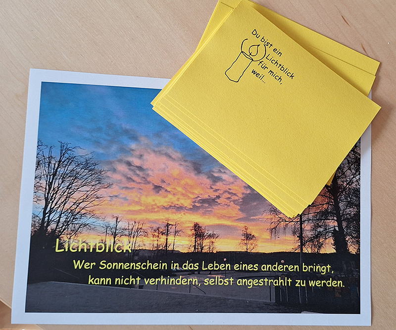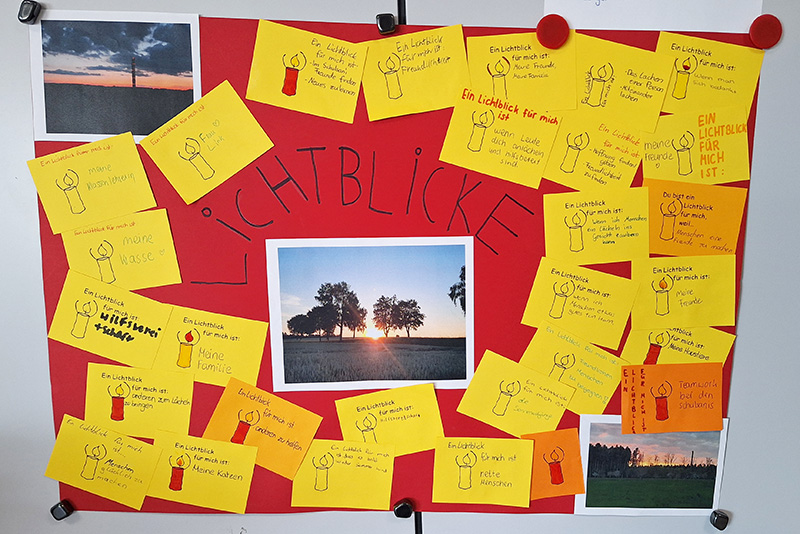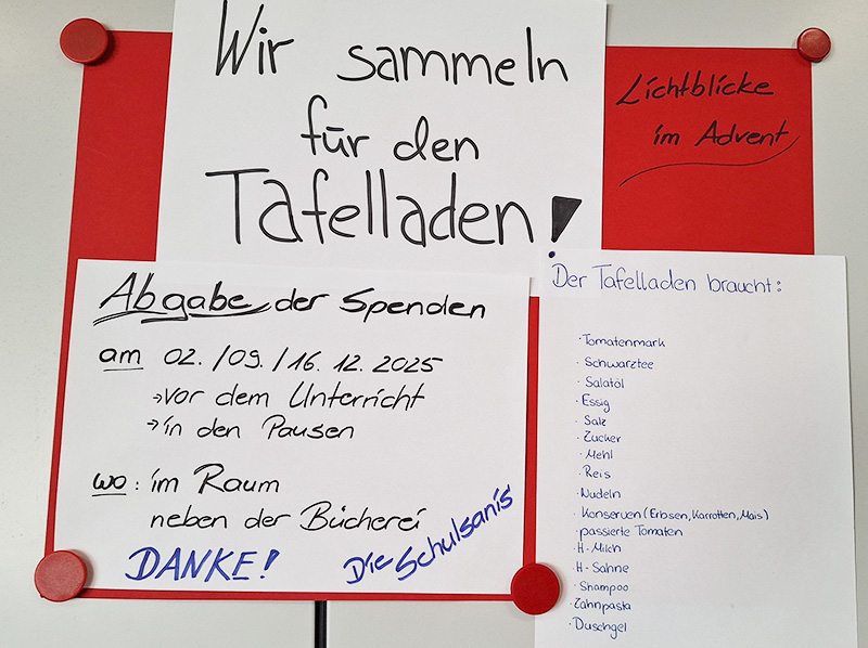 Doch nicht nur auf diejenigen, die sich das Einkaufen im Supermarkt nicht immer leisten können, wollen die Sanis in der Adventszeit aufmerksam machen. Sie wollen die ganze Schulgemeinschaft animieren, vor Weihnachten einen "Lichtblick zu verschenken", indem sie eine Karte an unserer Gestaltungswand ausfüllen und sie einer Person schenken, die ihnen sehr viel bedeutet und deshalb ein Lichtblick im Leben für sie ist.