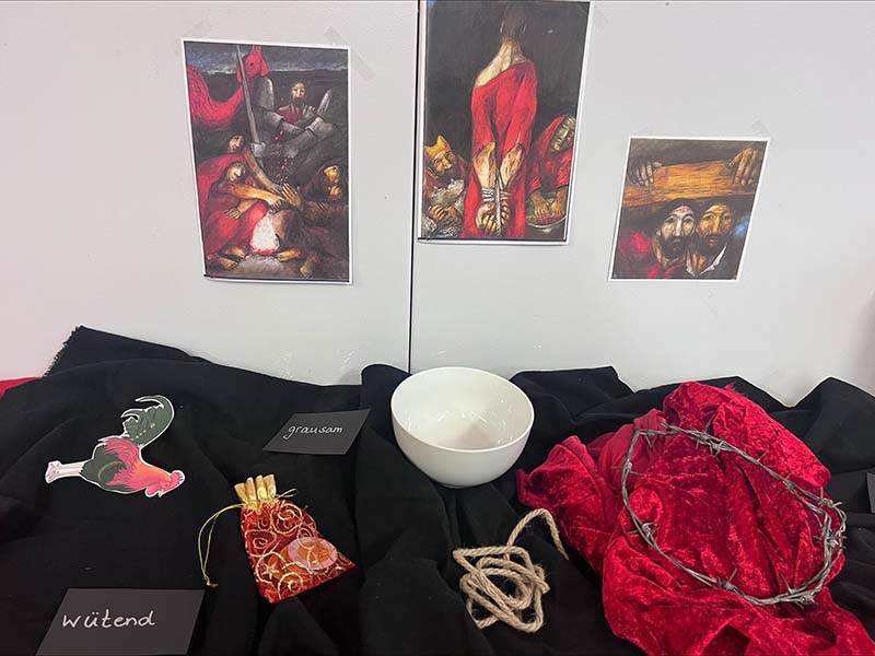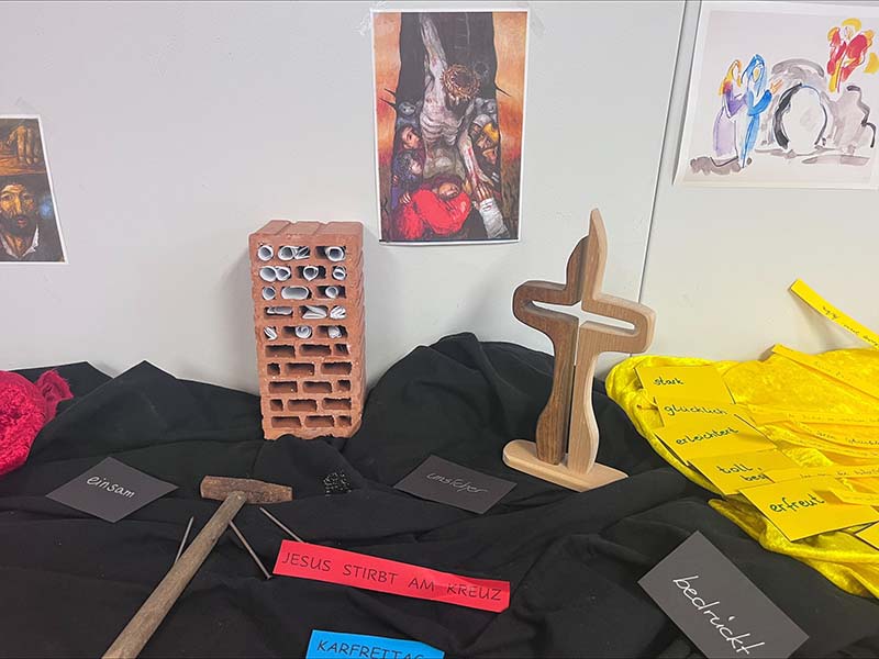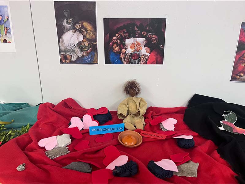 Unterstützt wurde die Klasse von Frau Müller aus dem Schulpastoralteam und Klassenlehrerin Frau Neher. Ein aufwändiger Torbogen wurde zuhause von einer Schülerin gebastelt und im textilen Werken nähte die Klasse kleine Sitzkissen und Herzen, sodass der Osterweg zu einem facherübergreifenden Projekt wurde, an dem alle mit Eifer mitgearbeitet haben.
