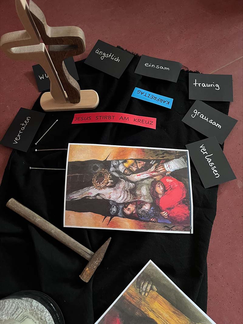 Diese Station handelte von Jesu Leiden und Sterben am Karfreitag. Ein gemeinsamer Kreuzweg wurde mit verschiedenen Materialien gelegt und die Kinder überlegten gemeinsam: "Wie fühlten sich die Freunde von Jesus? Wie würdest du dich fühlen?" Passende Adjektive wurden auf schwarze Kärtchen geschrieben.