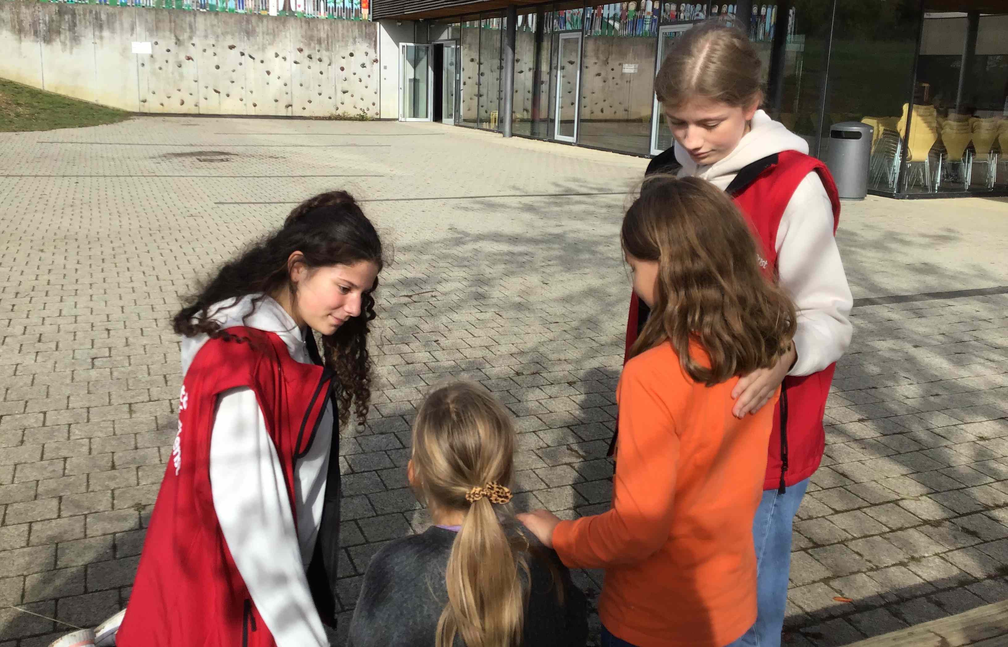An unserer Schule gibt es einen Schulsanitätsdienst. Wir sind 19 Schüler, die bereit sind, unseren Mitschülern zu helfen, wenn sie sich verletzt haben. Ausgebildet und betreut werden wir von Herrn Bauer und Frau Müller.